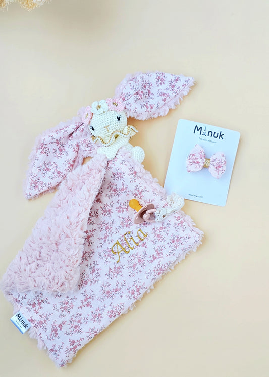 Coffret Naissance Personnalisé Doudou Attache tétine Lapin avec couronne fleurie Barrette cheveux