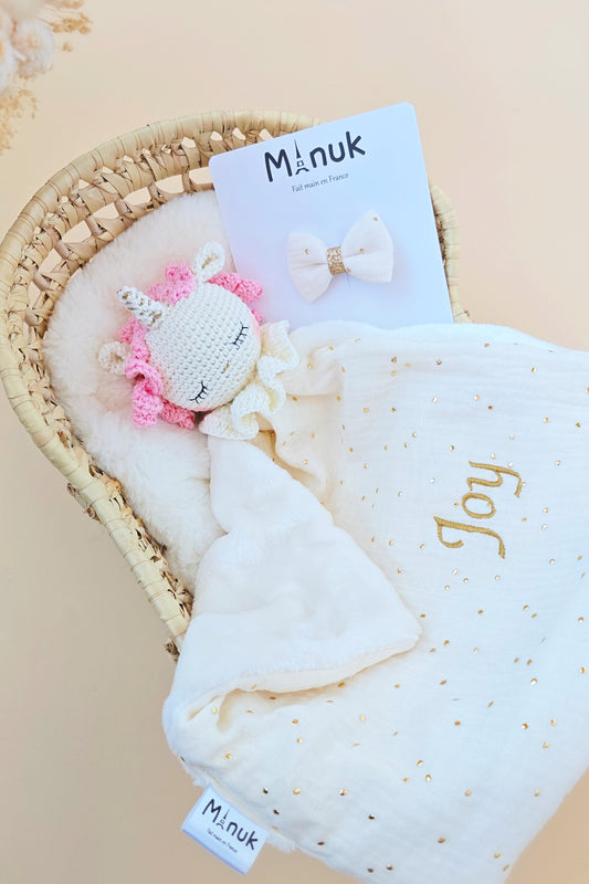 Coffret Naissance personnalisé Turban Chaussons Attache tétine Personnalisée