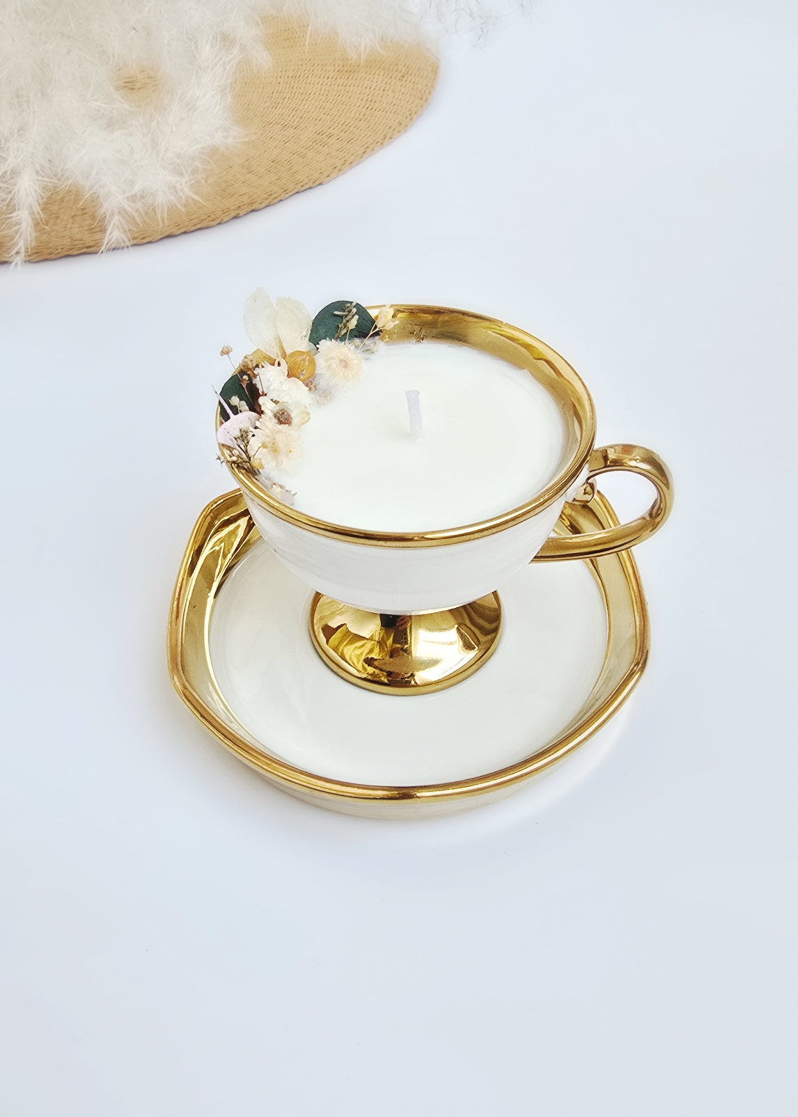 Découvrez une bougie parfumée artisanale, coulée à la main dans une élégante tasse à café en porcelaine avec sa sous-coupe assortie. Chaque pièce est soigneusement décorée de fleurs séchées, ce qui en fait un objet à la fois décoratif et chaleureux.